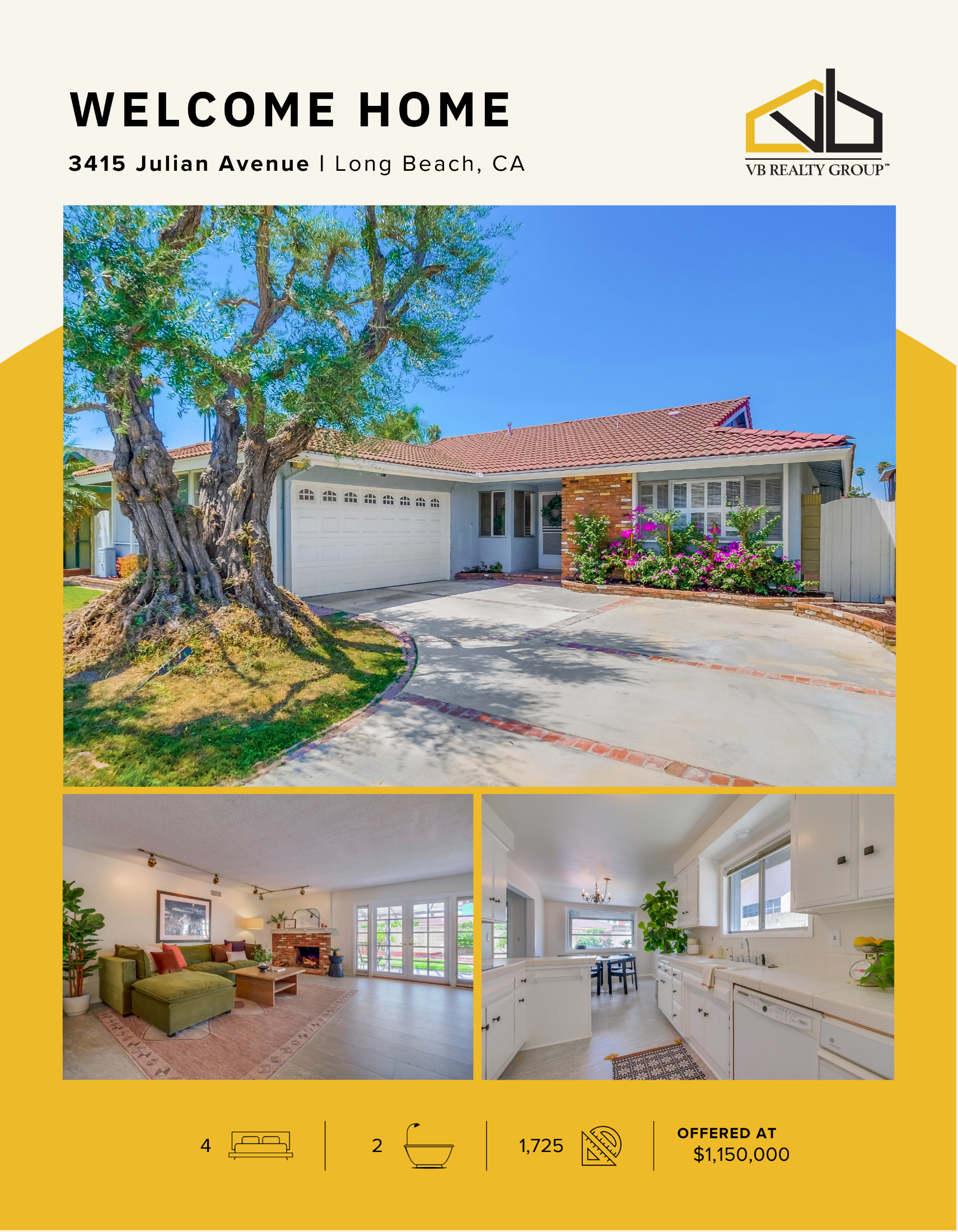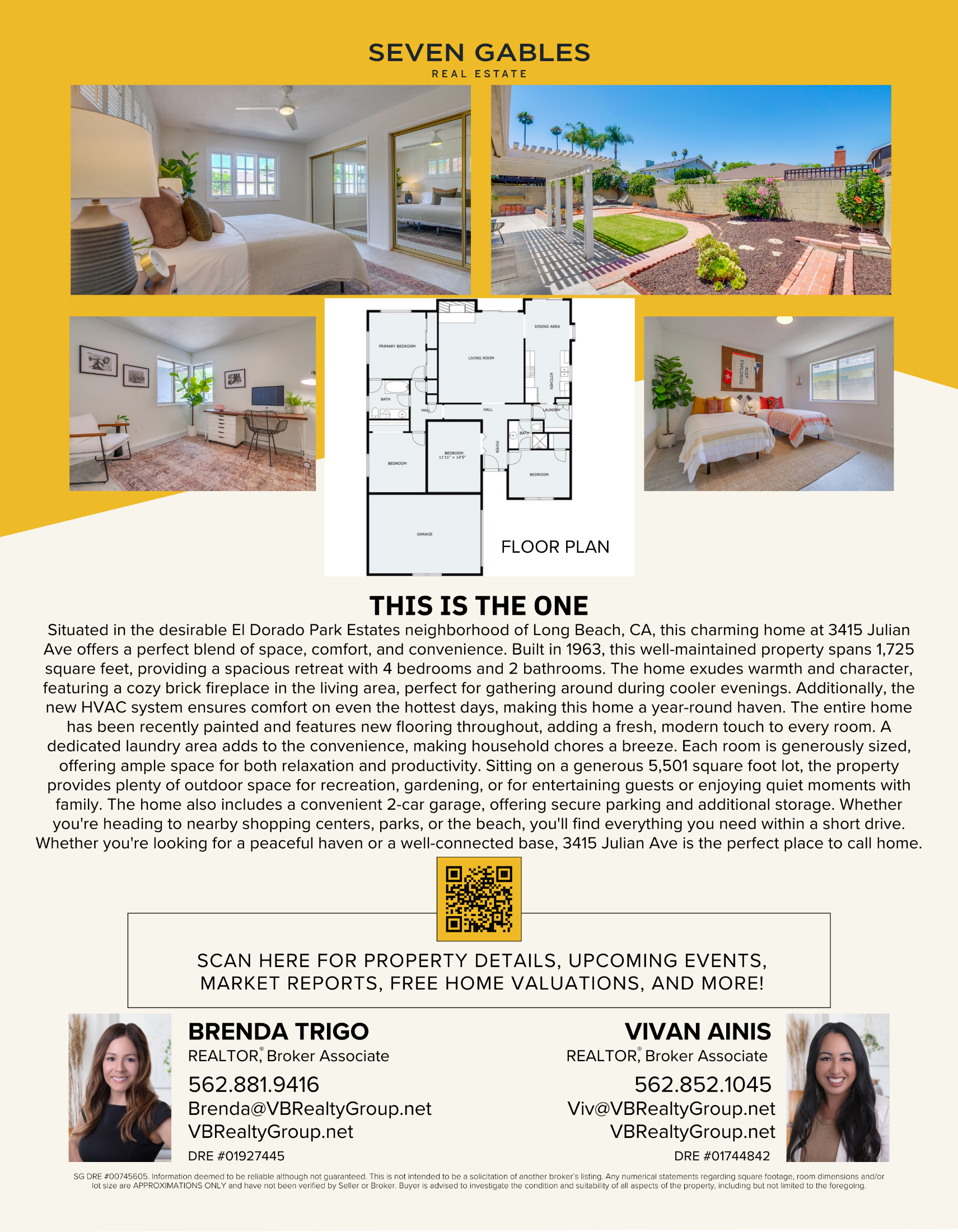 Situated in the desirable El Dorado Park Estates neighborhood of Long Beach, CA, this charming home at 3415 Julian Ave offers a perfect blend of space, comfort, and convenience. Built in 1963, this well-maintained property spans 1,725 square feet, providing a spacious retreat with 4 bedrooms and 2 bathrooms. The home exudes warmth and character, featuring a cozy brick fireplace in the living area, perfect for gathering around during cooler evenings. Additionally, the new HVAC system ensures comfort on even the hottest days, making this home a year-round haven. The entire home has been recently painted and features new flooring throughout, adding a fresh, modern touch to every room. A dedicated laundry area adds to the convenience, making household chores a breeze. Each room is generously sized, offering ample space for both relaxation and productivity. Sitting on a generous 5,501 square foot lot, the property provides plenty of outdoor space for recreation, gardening, entertaining guests, or enjoying quiet moments with family. The home also includes a convenient 2-car garage, offering secure parking and additional storage. Whether you're heading to nearby shopping centers, parks, or the beach, you'll find everything you need within a short drive. Whether you're looking for a peaceful haven or a well-connected base, 3415 Julian Ave is the perfect place to call home.