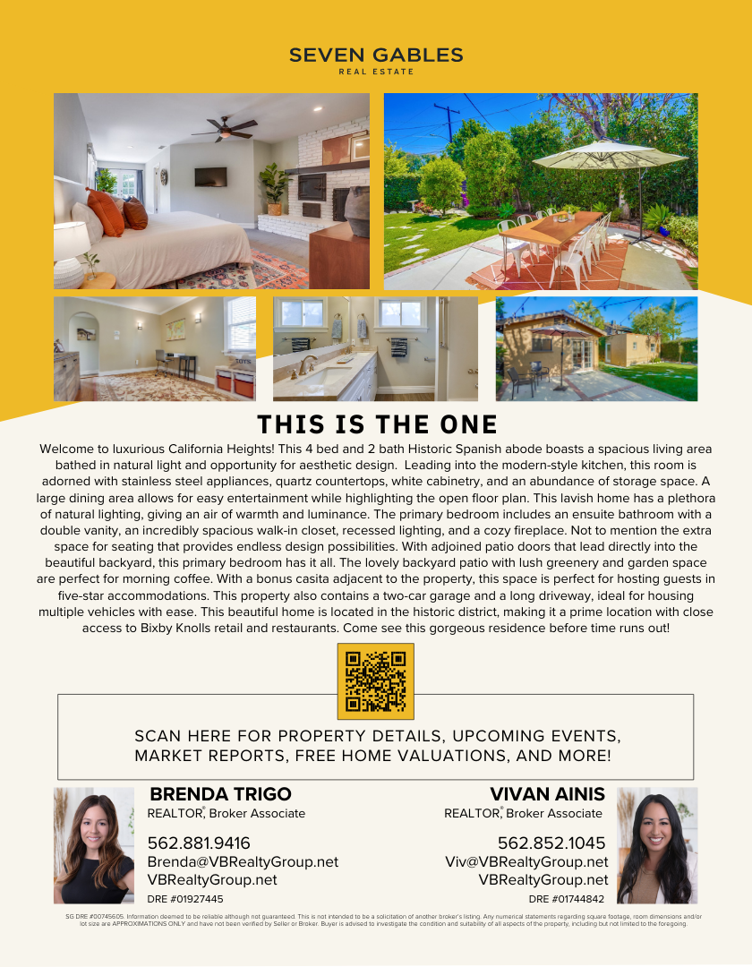 Welcome to luxurious California Heights! This 4 bed and 2 bath Historic Spanish abode boasts a spacious living area bathed in natural light and opportunity for aesthetic design. Leading into the modern-style kitchen, this room is adorned with stainless steel appliances, quartz countertops, white cabinetry, and an abundance of storage space. A large dining area allows for easy entertainment while highlighting the open floor plan. This lavish home has a plethora of natural lighting, giving an air of warmth and luminance. The primary bedroom includes an ensuite bathroom with a double vanity, an incredibly spacious walk-in closet, recessed lighting, and a cozy fireplace. Not to mention the extra space for seating that provides endless design possibilities. With adjoined patio doors that lead directly into the beautiful backyard, this primary bedroom has it all. The lovely backyard patio with lush greenery and garden space are perfect for morning coffee. With a bonus casita adjacent to the property, this space is perfect for hosting guests in five-star accommodations. This property also contains a two-car garage and a long driveway, ideal for housing multiple vehicles with ease. This beautiful home is located in the historic district, making it a prime location with close access to Bixby Knolls retail and restaurants. Come see this gorgeous residence before time runs out!