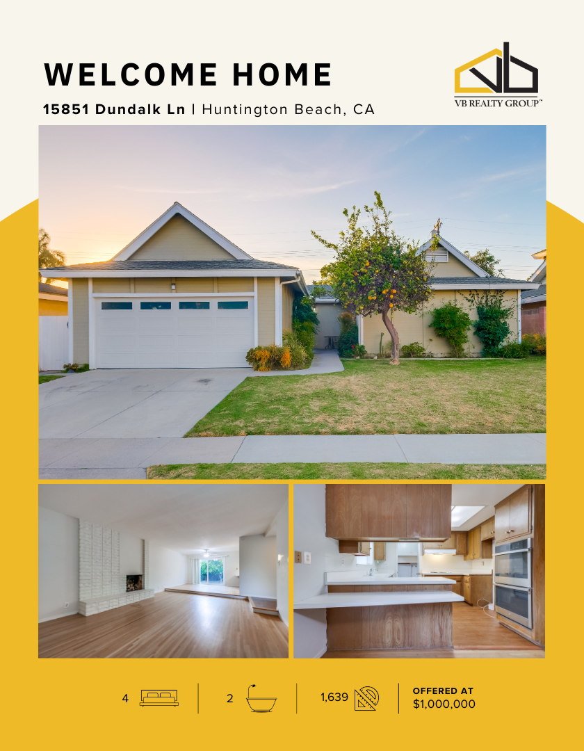 Welcome to this charming 4-bedroom, 2-bathroom home in the highly sought-after Dutch Haven America neighborhood of Huntington Beach. Spanning 1,600 sq ft on a 6,229 sq ft lot, this home offers a perfect blend of comfort and style. As you enter, you'll be greeted by beautiful hardwood floors and a cozy, step-down living room featuring a fireplace—ideal for relaxing evenings. The open dining area seamlessly flows into the spacious kitchen, which includes a breakfast bar, double oven, and ample counter space, perfect for both daily meals and entertaining. The front-facing primary bedroom features dual closets, while three additional bedrooms provide plenty of flexibility for family, guests, or a home office. The primary bathroom includes a double-sink vanity and a shower with tile walls. Outside, enjoy the expansive front and back yards, offering plenty of room for outdoor activities or simply unwinding. The detached 2-car garage and interior laundry room add convenience to your daily routine. With its unbeatable location and comfortable living space, this home is ready for you to move in and make it your own!