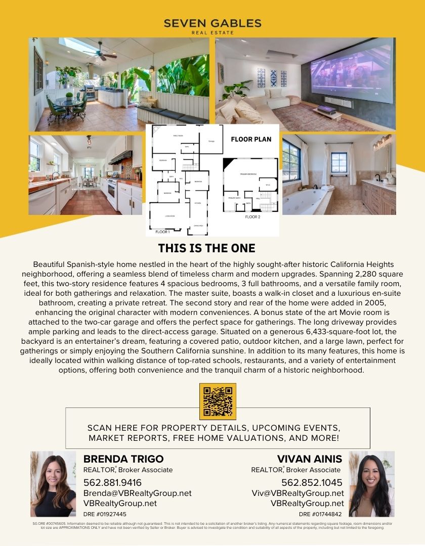 Beautiful Spanish-style home nestled in the heart of the highly sought-after historic California Heights neighborhood, offering a seamless blend of timeless charm and modern upgrades. Spanning 2,280 square feet, this two-story residence features 4 spacious bedrooms, 3 full bathrooms, and a versatile family room, ideal for both gatherings and relaxation. The m aster suite, boasts a walk-in closet and a luxurious en-suite bathroom, creating a private retreat. The second story and rear of the home were added in 2005, enhancing the original character with modern conveniences. A bonus state of the art Movie room is attached to the two-car garage and offers the perfect space for gatherings. The long driveway provides ample parking and leads to the direct-access garage. Situated on a generous 6,433-square-foot lot, the backyard is an entertainer’s dream, featuring a covered patio, outdoor kitchen, and a large lawn, perfect for gatherings or simply enjoying the Southern California sunshine. In addition to its many features, this home is ideally located within walking distance of top-rated schools, restaurants, and a variety of entertainment options, offering both convenience and the tranquil charm of a historic neighborhood.